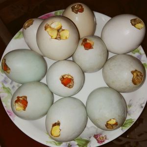 咸蛋、鸡蛋在一头敲出个小口,倒出蛋白,只留蛋黄。
