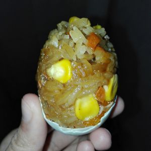 将拌匀的糯米馅料灌入蛋里,九分满即可。