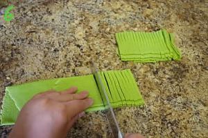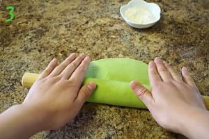 将圆面片一直擀到大概低于1mm的厚度时,将面片打开,撒上少许面粉扫开,将面片叠成一叠;
