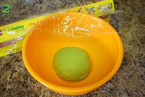 将鸡蛋液和菠菜汁充分拌匀,一边搅拌一边将混合液加入到面粉里,揉成较为光滑的硬面团,覆盖保鲜膜饧20分钟左右;