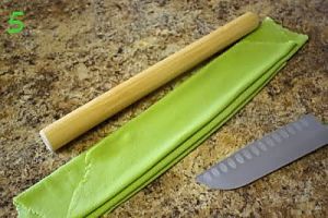 在圆面片上撒上少许面粉用手扫均匀,之后将圆面片卷在擀面杖上,用均匀、较大的力道擀开,中途不停的打开、卷起、并变换方向擀制,尽量使面片各处受力一致,厚薄均匀;