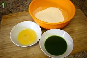 中筋面粉(All purpose flour)盛入乐扣3P色拉盆,鸡蛋充分打散,菠菜加盐揉捏后过滤挤出菠菜汁;