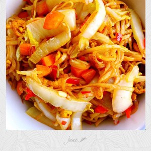 在锅中放入少量油,先放入鸡蛋再放入娃娃菜胡萝卜翻炒,最后放入面条,放入酱油、辣椒酱、盐。用筷子炒面条不容易断。