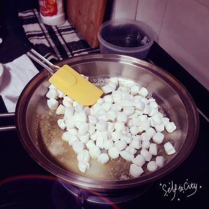小火融化黄油,然后倒入棉花糖,搅拌使棉花糖融化(提前将棉花糖剪小块更容易融化哟)