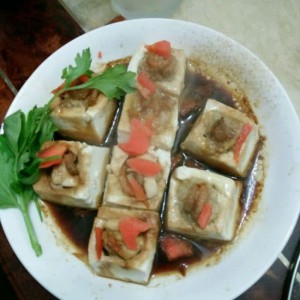塞入肉,最上面按上虾仁,生抽淋在豆腐表面。