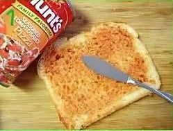 土司面包片上均匀的抹上一层皮萨番茄酱;