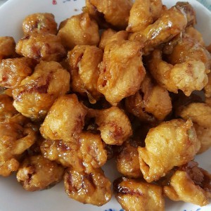 5颗蒜切成蒜末,用一勺料酒,三勺白醋,四勺糖,五勺水,成比例调成汁;热锅凉油,下蒜末爆香后,倒入调好的糖醋汁,大火烧至冒泡后,关小火熬至微稠,倒入炸好的肉块,裹匀