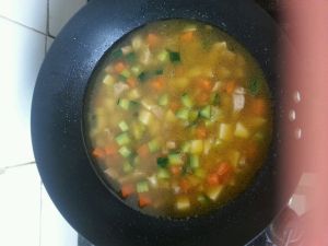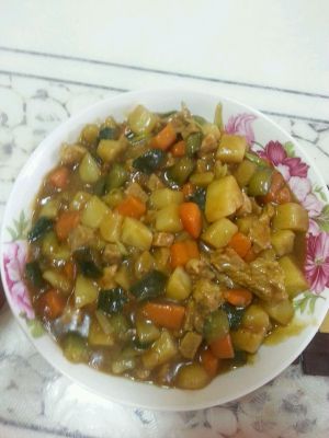 食材炖熟后 放入咖喱收汤斟 一定不要把汤靠干了 然后放些葱花