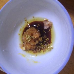 瘦肉切成末后,放入一勺芝麻油、两勺酱油、半勺盐和姜末,顺时针方向搅拌均匀。