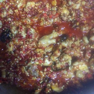 待锅中鸡肉炒熟,水分蒸发干,就将之前做好的糍粑辣椒放进锅里,同鸡肉一起炒,要经常翻炒,以免糊了。也可以另起一锅,放油,将糍粑辣椒炒干炒香,待锅里的鸡肉炒出油时,再放入辣椒。