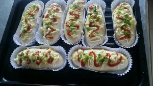 收口朝下放入模具,二发完成后刷蛋液,放上马苏里拉,挤上番茄酱和沙拉酱,最后撒上葱花