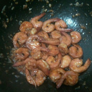 4 热锅 倒油 炒菜的量就行了倒入大虾炒 慢慢翻炒 全部变色了倒容器里
