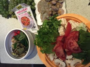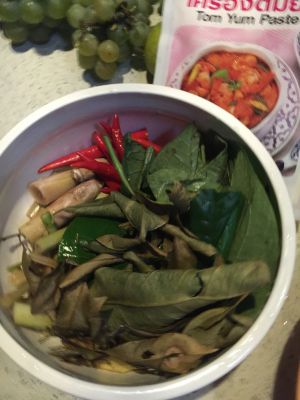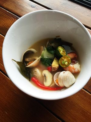 高汤烧开,放入香料调味,放进青柠当白醋用挤在汤里,加入椰浆,加入盐,和冬阴功酱,边加可以尝尝调味