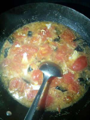 起锅,加入香油,待锅温后放入西红柿翻炒后,再加入木耳翻炒一分钟,加水,待锅烧开后,放入已经打好的鸡蛋,盖上锅盖(不好意思,中间部分照片未拍,步骤就不分开了,这张图是烧好后的图片)