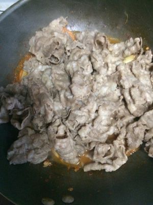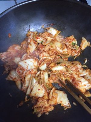 泡菜单独在锅中炒一下,然后加入少量先前煮肥牛的水