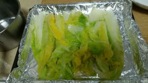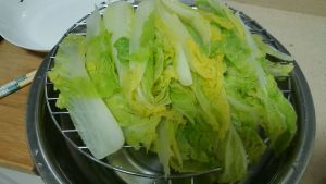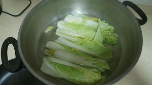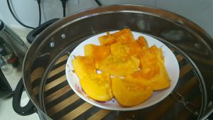 蒸南瓜的时候把娃娃菜切成四部分,水里加数滴花生油和一半盐,水开后把娃娃菜下锅焯一下