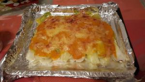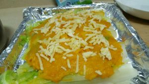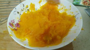 上面铺上炒好的南瓜泥,最后撒上奶酪