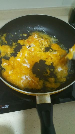 黄油融化后把南瓜泥放到锅里,同时加黑胡椒,加面粉炒一下,融和就可以了