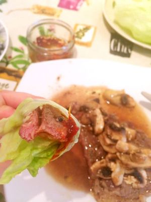 6,取出烤牛排,装盘。刀叉将牛排切片,沾辣椒酱,用生菜包住,开吃!