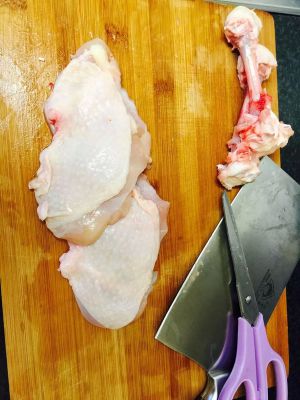 鸡大腿剔骨。。。这图是我另外一次做的,是小腿(注意是小腿不是翅根啊。。。),大腿剔下来之后皮的分布会更好。这样煎的时候不需要放油。如果是鸡小腿就要加少许油。剔下来的骨头可以煮个鸡汤(活在英国不容易啊。。。)。