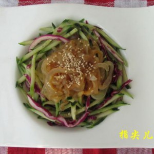 再将拌好的青菜丝放在盘底,在上面放好海蜇丝,再撒上点芝麻即可。