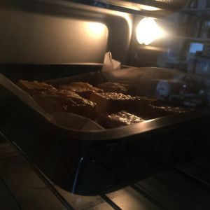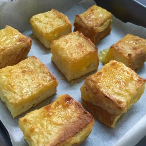 快速把面包砖…表面沾满酱…抹平…放烤箱…230度…上层…5.6分钟…表面焦黄…就可以了…(也可以放中层200度5.6分钟…待整个面包略脆时…放上层230度…烤1分钟…)注意看火…