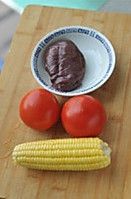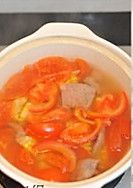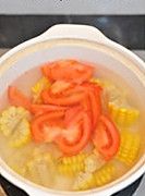 锅中玉米煲10分钟后,番茄切块放入锅中一起煲。
