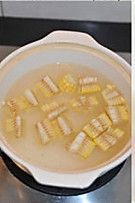 玉米切成小段,砂锅中放半锅清水,放入玉米段和姜丝,大火煮开后,转小火煲10分钟。