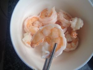 把剥好的虾扔开水里烫一下,烫成红色,并卷成虾球捞出来