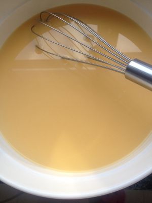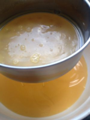 过两遍筛之后,拿小碗装跟蛋液等量的温开水,放入盐等它溶化后慢慢倒进装有蛋液的容器,轻轻搅拌匀,不要让蛋液起气泡