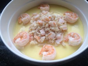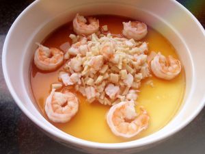 把蒸好的鸡蛋羹从锅里端出来,掀开保鲜膜,把备用的杏鲍菇和虾铺好,然后继续盖上保鲜膜,放入锅中,小火蒸3分钟。(撕保鲜膜时小心烫手)
