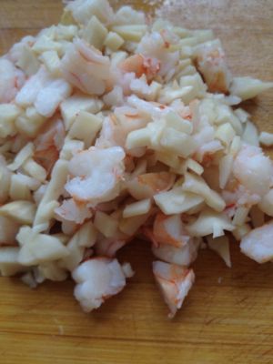 拿出5只虾,切成小块,和杏鲍菇混在一起备用