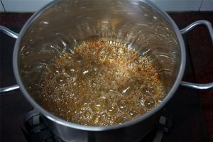 继续小火加热至糖水开始出现金黄色,这时可以轻轻晃动锅,使其均匀上色。
