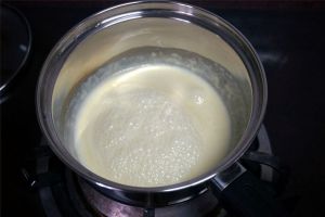 这个时候另起一个锅将淡奶油煮沸腾,用中火,很快就沸腾了。