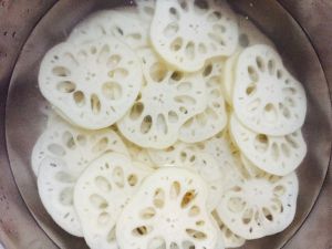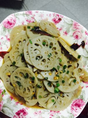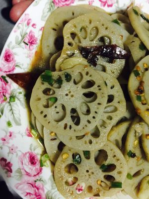 锅里热油,放入辣椒蒜头爆香,然后放入藕片翻炒,加一点冷水,大火翻炒,加入盐,糖,生抽,醋调味