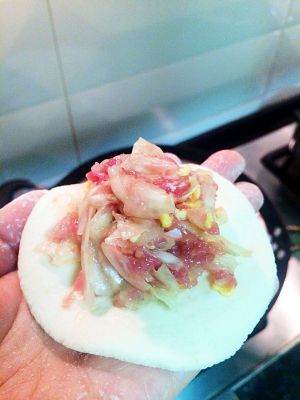 擀面,中间厚边缘薄,包馅收口。我一直包得不好看,收口处总会有个小揪揪。^-^ 自学的,没人教啊。儿子喜欢馅儿多,再怎么样包得也不漏不破,还过得去。