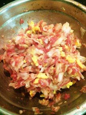 晚餐18:30结束,赶紧制馅。手剁猪肉成糜;白菜用小苏打浸泡30分钟去农药残留之后,切小块用盐腌制30分钟,再挤出水;鸡蛋打散调盐煎熟。调入蚝油、姜末、少量胡椒粉(提鲜),拌匀馅料。