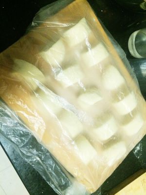 发好的面团在板上柔和几分钟排气,再切分成一个一个剂子。盖上保鲜膜防止表皮变干。
