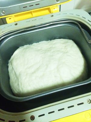 单位离家很近,中午还能在家午休。面包机1杯水3杯面粉的比例,少撒点盐、糖,兑上稀释后的干酵母,按上自动发面档,就可以不管了。晚餐后已经发得很好了,现在11月中旬,南方气温大约在17度。
