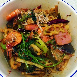 锅入油,下葱姜蒜,干红椒,麻椒,爆香。入青椒,郫县豆瓣酱。煸炒出香味,入鲜虾,炒至虾变色。入火腿片,小丸子。最后倒入之前焯好的蔬菜翻炒。郫县酱本身很咸,基本不用再放盐了