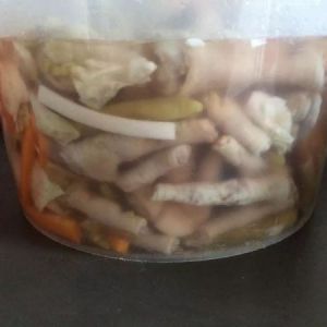 再将提前泡好的泡菜和煮好的凤爪泡在一起