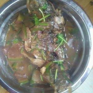 另起锅烧油,待油热后放入白糖炒成焦糖色,放入切好的葱段和大蒜,依次再放入生抽老抽调味。以后锅内倒入热水,放入提前煎好的鱼。小火炖10分钟左右待入味以后大火收汁,出锅前把香菜均匀撒入鱼身,浇上鱼汤就可以出锅了。
