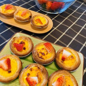 把调好的蛋挞液放入蛋挞皮中,8分满(9个蛋挞)
