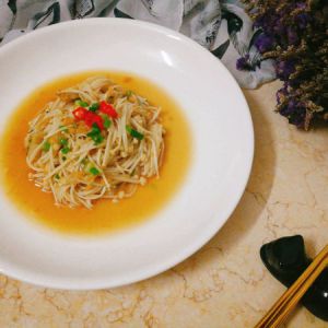 金针菇切掉根部,清洗干净,撕成一小撮,放在盘子上。