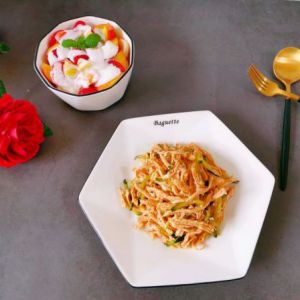 黄瓜切成丝,蒜切成蒜蓉,放入鸡丝上