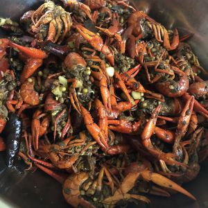 3起锅烧油,加入2里面的调料,炒香,加入小龙虾翻炒至虾尾卷起,倒入适量水,加盐,加啤酒大火烧开转小火。