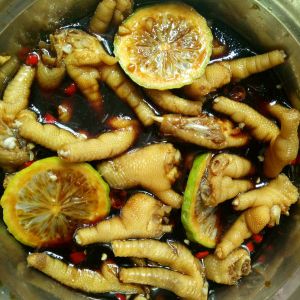 2.锅里放水,鸡爪冷水下锅,放入姜片,八角,中火,煮至漂浮物出现后三分钟,捞起,冲洗凉白开