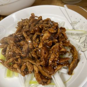将肉丝放入锅中搅拌,待每个肉丝都抹上厚厚的酱汁后就可出锅。