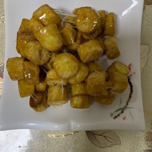 在把炸好的山药倒进去翻炒,使每个山药均匀裹上糖,出锅前撒点芝麻,一道外酥里嫩,甜而不腻的拔丝山药就做好了