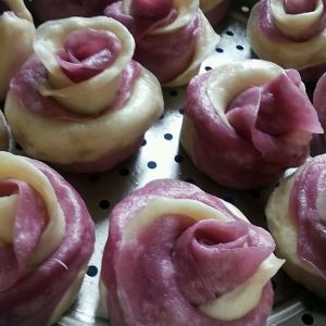 温水加入孝母,白糖熔化,到入面粉揉成一团,分一半加入碾碎紫薯揉均匀,